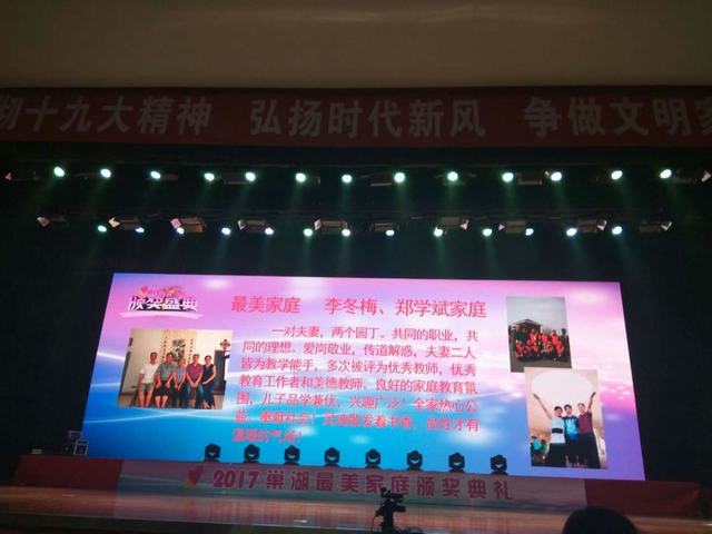 日前,2017巢湖最美家庭和2017合肥最美家庭评选结果相继揭晓,我院郑学斌老师家庭均榜上有名。颁奖典礼上,郑学斌老师和爱人李冬梅老师的最美家庭事迹打动了在场的每一位观众,颁奖词写道:一对夫妻,两个园丁。共同的职业,共同的理想。爱岗敬业,传道解惑,夫妻二人皆为教学能手,多次被评为优秀教师,优秀教育工作者和美德教师。良好的家庭教育氛围,儿子品学兼优,兴趣广发。全家热心公益,奉献社会!灵魂散发着书香,品性才有温暖的气场。