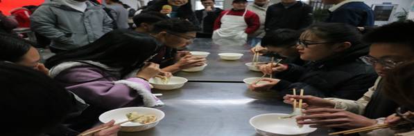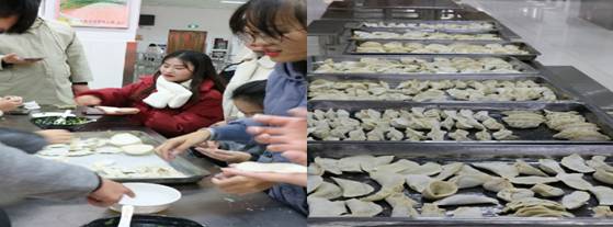 参加本次活动的同学热情高涨,在主持人的开场白后,包饺子比赛开始了!看着他们那灵活的小手不一会就包完了形状各异的饺子,大家脸上露出了欢快的笑容。