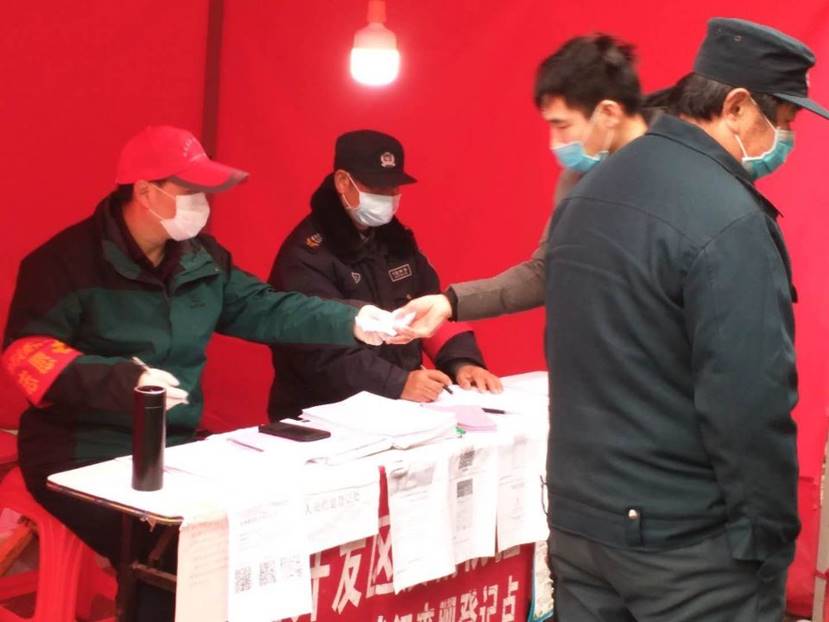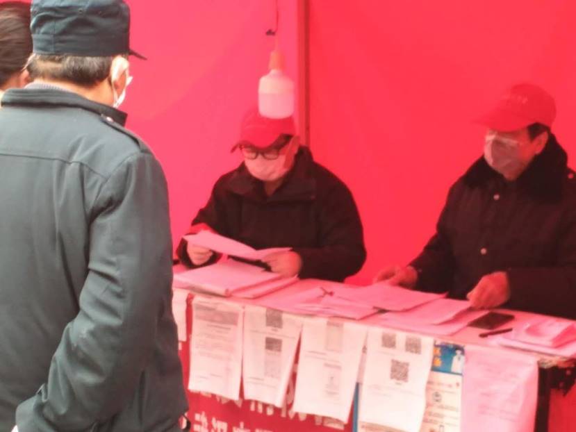 刘修树在临时搭建的疫情防控志愿服务台处检查并登记进出小区人员的基本信息。