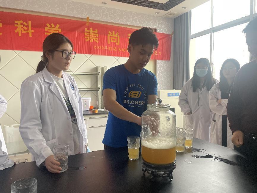 同时此时也正赶上实训项目内容——清香白啤和慕尼黑啤发酵结束,这是食品专业老师带领学生耗时两天亲自制作出来的自酿啤酒,属于教研室每年的特色实训内容,经过一个多星期的低温发酵,老师们拿来了酒杯,邀请参加活动学生一一品尝,食品感官检测是一项非常重要的品鉴技能,根据人的感觉器官对食品的各种质量特征的“感觉”,如:味觉、嗅觉、听觉、视觉等;用语言、文字、符号或数据进行记录,再运用统计学的方法进行统计分析,从而得出结论,对食品的色、香、味、形、质地、口感等各项指标做出评价的方法。老师教导学生们采用“一看、二嗅、三尝、四品”的方法对两种啤酒做出合理的评价,教授学生科学方法评价啤酒乃至部分食品的感官评分,大大拓宽学生知识面,最后在一片片欢声笑语中完成啤酒的品尝学习。