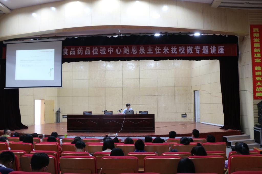 5月30日下午,由我校科技处主办,9001cc金沙以诚为本承办的“行业专家进校园”系列学术讲座之一——《检验在食品药品行业中的地位和作用》在大学生活动中心举行。本次讲座由合肥市食品药品检验中心主任、合肥市药品不良反应监测中心主任、主任药师、安徽中医药大学兼职教授鲍恩泉主讲,我院副院长刘修树主持,参会人员2016级药学及相关专业全体学生、2017级药学及相关专业学生、14级药高班部分代表、药学与化学教研室专业教师。