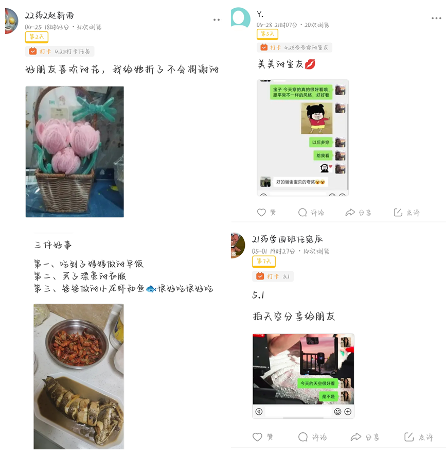 打卡活动在“合职院9001cc金沙以诚为本”公众号上一经发布,就得到了21级和22级学生的广泛关注。活动伊始,共有118名同学报名参加。依托微信小程序“小打卡”让同学们在指定圈子里发布每日打卡照片,最后完成6日、12日、18日、24日连续打卡的分别有86、79、63、21名同学。打卡任务分为“好友”“家人”“日常”“学习”等模块,比如“给自己最好的朋友打个电话”、“夸夸你的室友”、“为同学做件小事”等任务加强了同学们之间的联系,使他们在完成任务的过程中体会到沟通和助人的乐趣。发布“给家人写封信”、“为妈妈做张贺卡”等任务让同学们解锁与亲人在一起的回忆,激活感恩的情绪。“拍摄一张今天的天空”、“去操场看看日落吧”等任务让同学们享受当下的美好,释放压力。在最后的总结暨分享大会上,同学们踊跃地分享自己印象中最深刻的趣事,他们还表示在任务中不仅收获了朋友家人的关心,也让自己的生活变得更加有序。