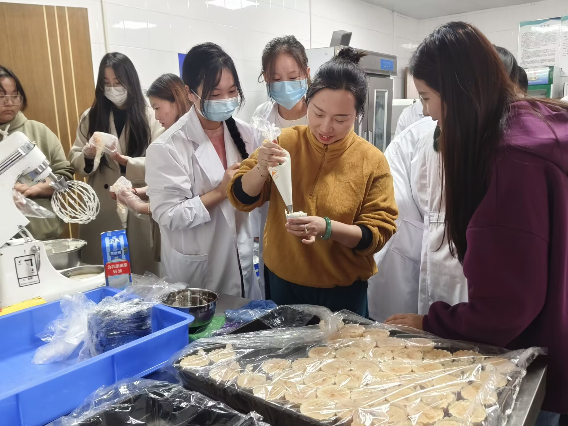活动开始,魔幻烘焙社社长王子轩管理现场签到,维持秩序,同时择取志愿者为活动准备所需材料,并规定活动人员需身穿白大褂,佩戴口罩,保证烘焙蛋糕制作过程中的卫生。活动最开始由指导老师展示奶油的打发、涂抹以及裱花。活动中,团总支书记肖昕与学生们一同制作手工DIY蛋糕,她强调大学生在学习专业课知识的同时也要将其运用之实践,不断提升自我的综合素质。活动结束之际,学生们纷纷同肖昕老师分享自己的心得,在进行合照记录美好时光之后一同品尝劳动成果。最后,团总支书记肖昕还指出活动结束要及时清扫台面、带走垃圾,注意个人卫生等。