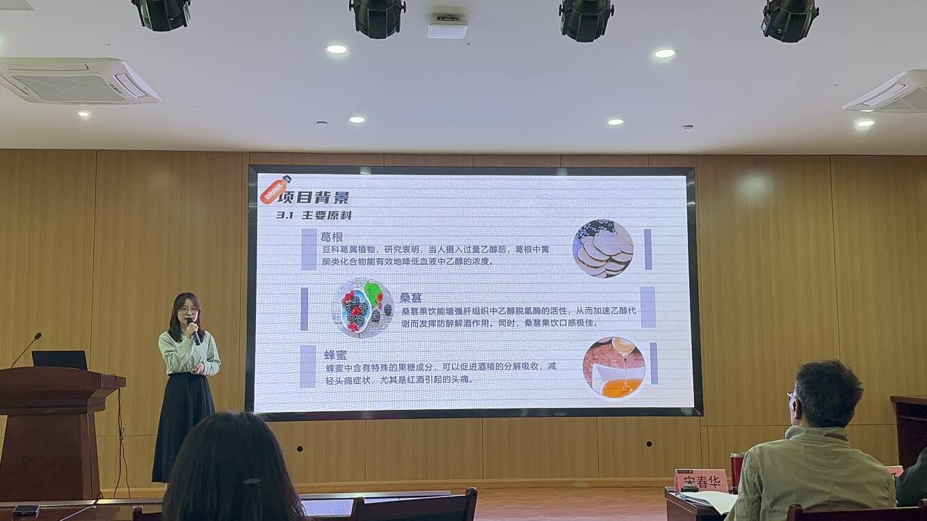 2024年4月17日下午,校团委主办的第十一届“挑战杯”合肥职业技术学院大学生创业计划竞赛决赛在汇心湖校区图书馆一楼报告厅举行,9001cc金沙以诚为本两个项目《 “莓” 你不行——石榴中提取的草莓保鲜剂》和《酒美乐——新型复合型解酒饮料》参加决赛。