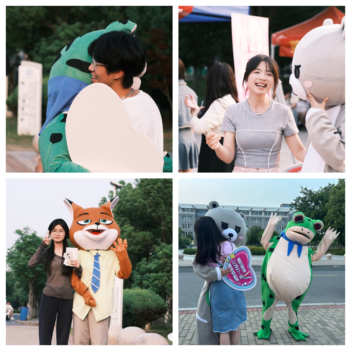 志愿者们身穿玩偶服,张开手臂等待拥抱。参与者可以与志愿者拥抱的同时,说出自己的烦恼,释放内心的压力。