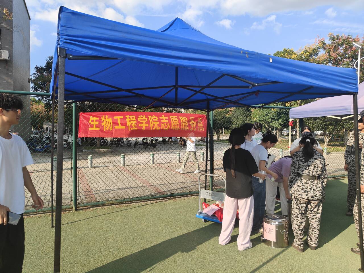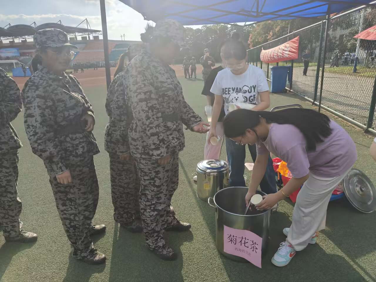 当天下午,药海拾贝社的成员早早来到了活动室,开始了菊花茶的制作,清洗冲泡完成之后,由志愿者运送到训练场,并且有序开展分发菊花茶行动。一位刚刚下训的新生接过茶杯,露出了惊喜的表情:“真的太贴心了,谢谢你们!”一位教官则感慨地说:“这茶喝下去,感觉整个人都清爽起来了。”这些简单的互动和反馈,让志愿者们感受到了付出的快乐和意义。
